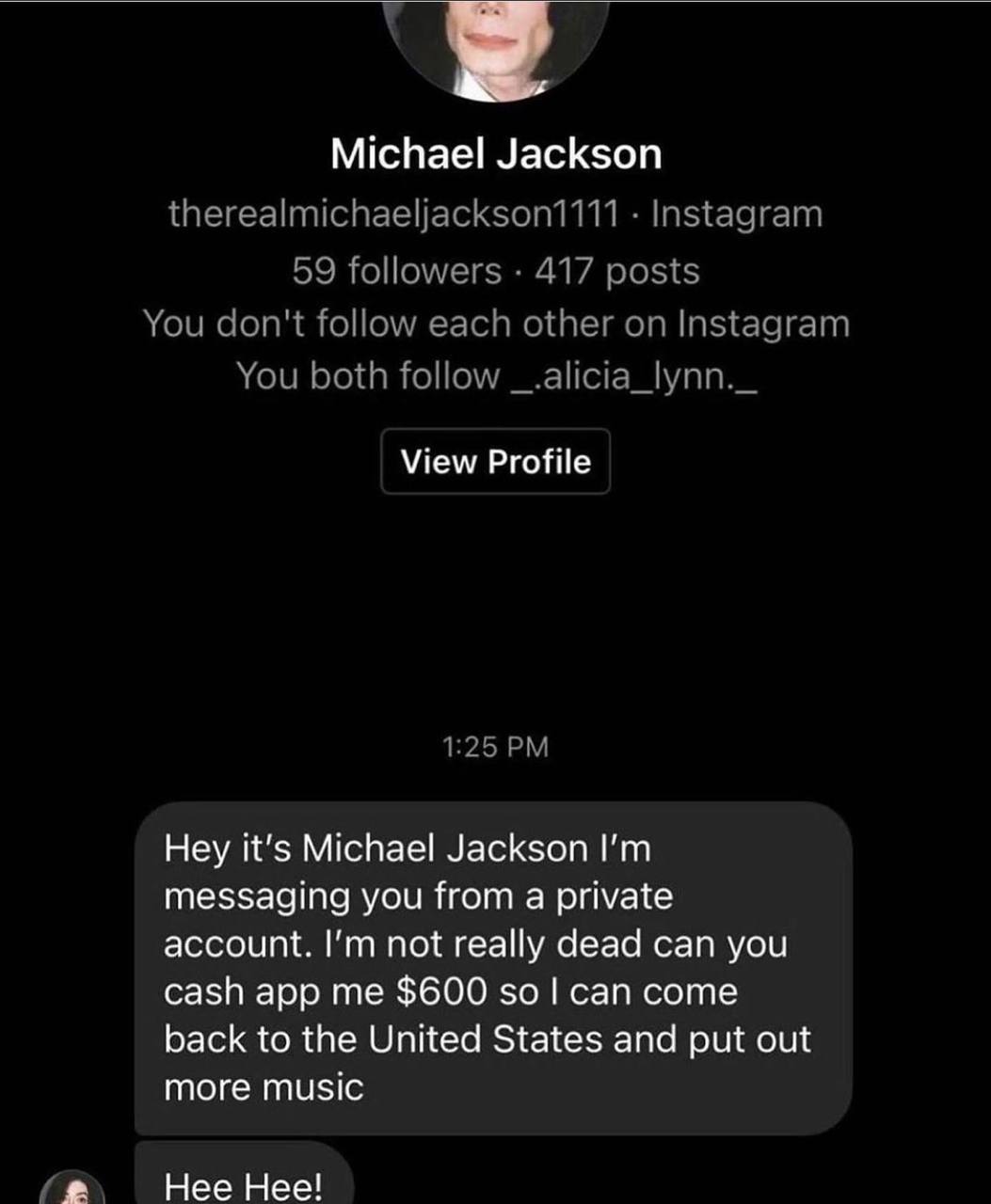 “Hey it’s Michael Jackson I’m messaging you from a private account. I’m not really dead can you cash app me $600 so I can come back to the United States and put out more music” 3